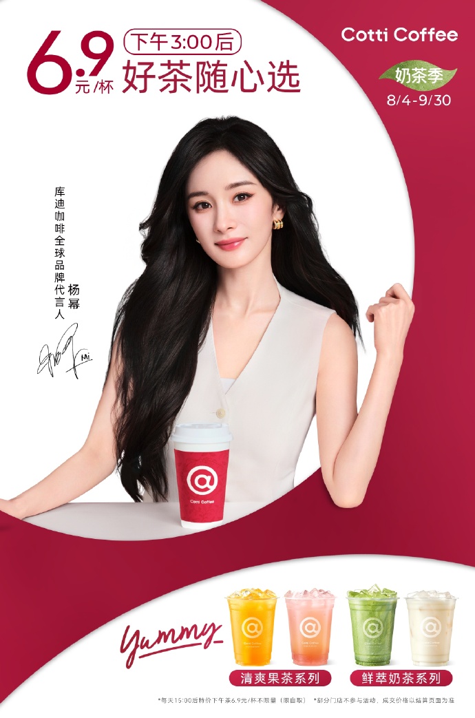 8 月 4 日,庫迪咖啡正式官宣全球品牌代言人楊冪(明星代言公司),并發(fā)布代言人短片。短片中,沿用代言人楊冪擅玩諧音梗的特質(zhì),邀請大家和楊冪一起解鎖好咖好茶好「yummy」,同時品牌同步上新羽衣系列飲品。