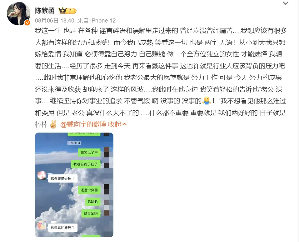 8月6日,陳紫函(明星經(jīng)紀(jì)公司)發(fā)文力挺老公戴向宇,稱自己對(duì)曝戴向宇嫖娼事件,只有兩個(gè)字無(wú)語(yǔ),她表示“這也許就是行業(yè)人應(yīng)該背負(fù)的壓力吧”,同時(shí)表達(dá)了對(duì)老公的理解和心疼,并告訴他沒(méi)事:“老公沒(méi)事繼續(xù)堅(jiān)持你對(duì)事業(yè)的追求,不要?dú)怵H,啊,沒(méi)事的,沒(méi)事的!”她還在和朋友的聊天記錄中透露自己心態(tài)對(duì)這件事的心態(tài)很好,并稱自己的老公終于紅了。