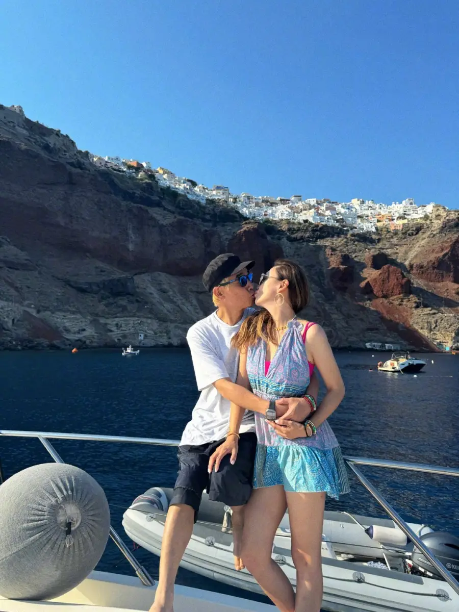 夫妻倆出海游玩,陳小春摟著應(yīng)采兒的腰恩愛又甜蜜。