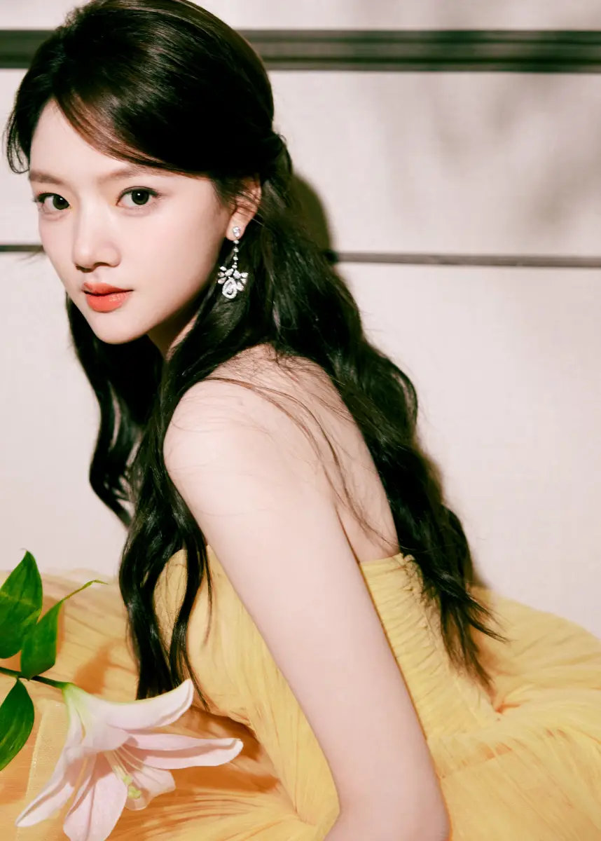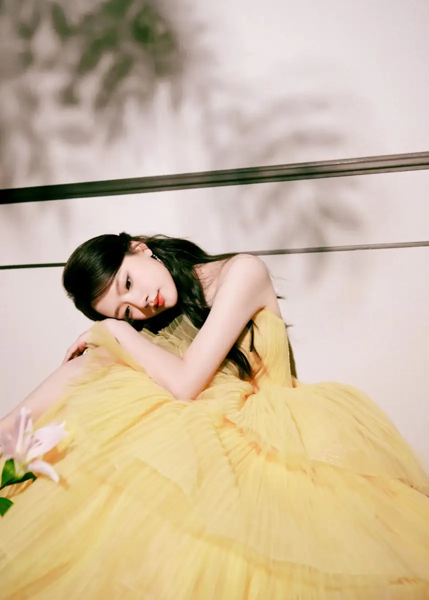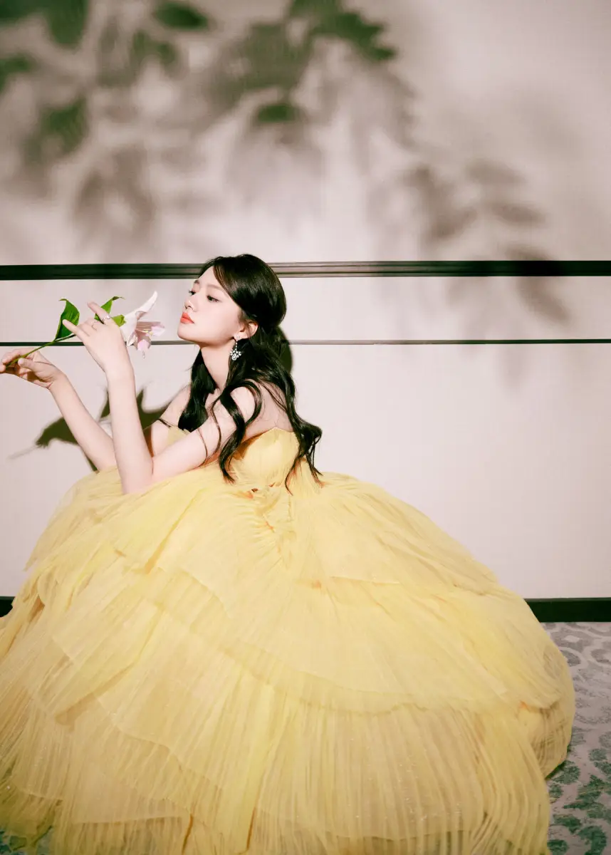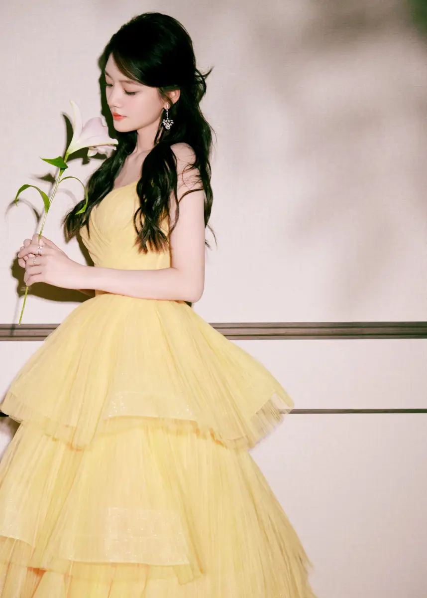 任敏穿黃色抹胸裙甜美動人 手捧鮮花盡顯少女情懷