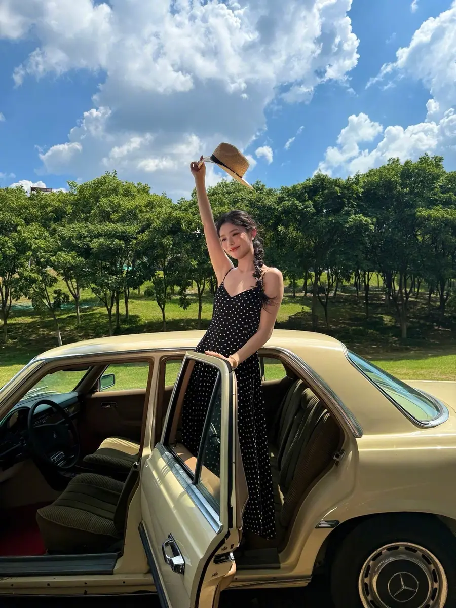 27日,林允(明星經(jīng)紀(jì)公司)在社交平臺(tái)上曬出一組戶外美照,她身穿黑色波點(diǎn)吊帶長(zhǎng)裙,站在車?yán)锾匠錾碜优恼?,狀態(tài)松弛,美貌養(yǎng)眼!