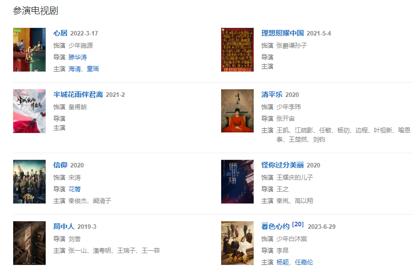 2020年3月,出演,王凱、江疏影主演的古代傳奇劇《清平樂》,并在該劇中飾演少年李瑋 。