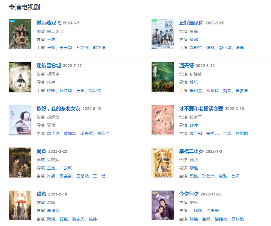 2021年2月18日,參演的都市情感劇《甜蜜》播出;5月28日,特別出演的奇幻愛情電影《奇花記》在騰訊視頻全網(wǎng)獨(dú)播;9月17日,主演的災(zāi)難電影《峰爆》上映;參演電視劇《小幸福》。