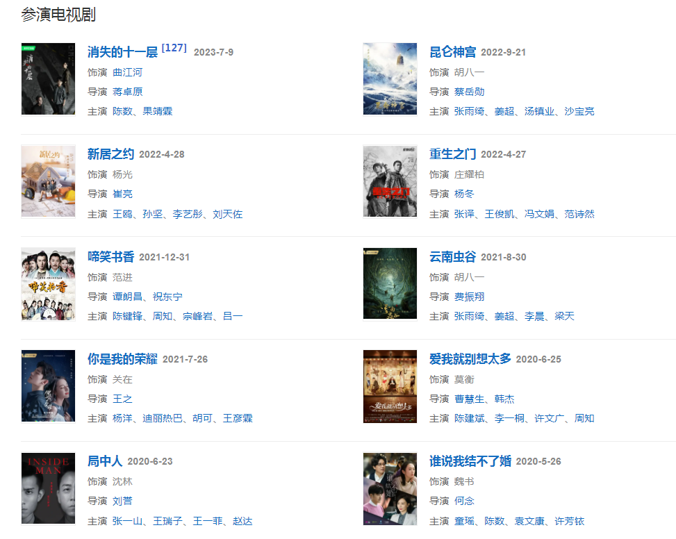 2020年4月1日,搭檔張雨綺、姜超領(lǐng)銜主演的超級網(wǎng)劇《龍嶺迷窟》在騰訊視頻全網(wǎng)獨(dú)播,劇中扮演胡八一一角。