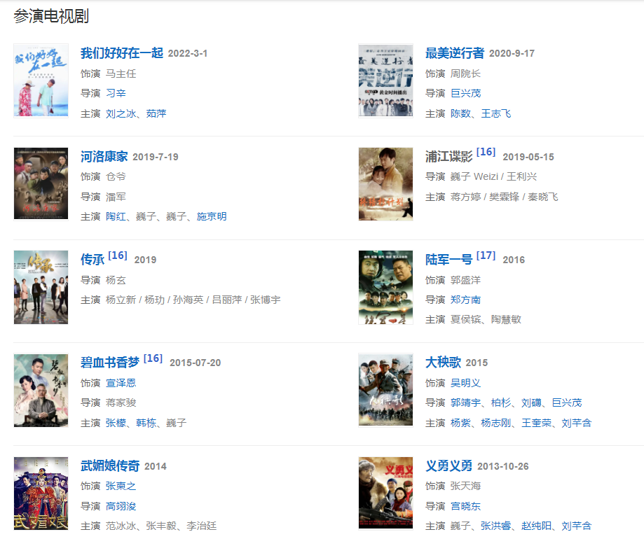 代表作品:黃河謠、情滿珠江、笑傲江湖、地下地上、鐵梨花、光榮大地、大戲法、打狗棍、一代梟雄