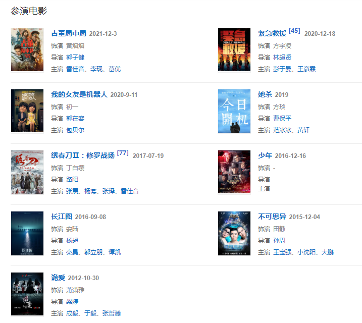 代表作品:怒晴湘西、長(zhǎng)江圖、繡春刀Ⅱ:修羅戰(zhàn)場(chǎng)、如懿傳、慶余年、帶著爸爸去留學(xué)、戀愛(ài)先生