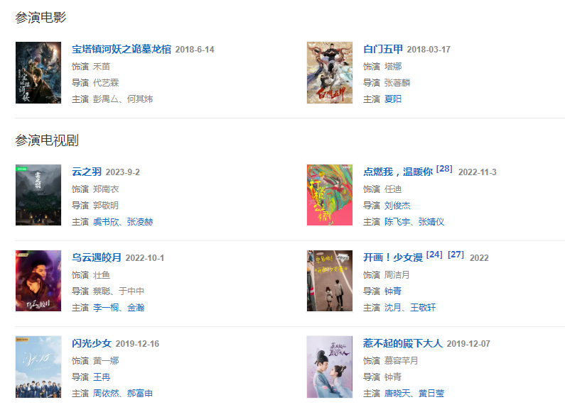 2018年1月,參演的武俠片《白門五甲》上映;隨后,她還主演了奇幻懸疑片《寶塔鎮(zhèn)河妖之詭墓龍棺》。2019年12月,主演的古裝愛情劇《惹不起的殿下大人》在雙平臺(tái)播出。
