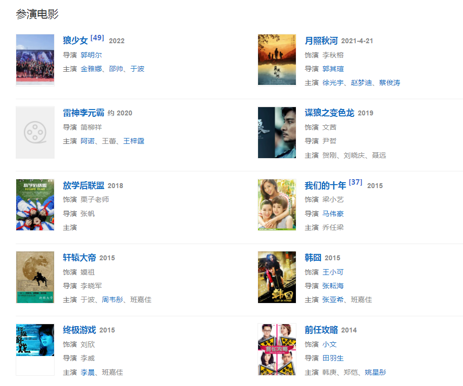 代表作品:前任攻略、我們的十年、脫軌時代、軒轅大帝、小城大愛、西藏秘密、瘋?cè)嗽?、北京女子圖鑒
