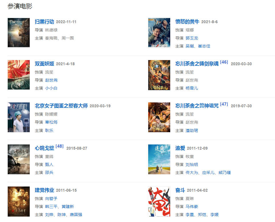2008年,憑借劇情片《立春》提名第27屆金雞獎最佳女配角獎;同年,她還主演古裝武俠劇《八大豪俠》。