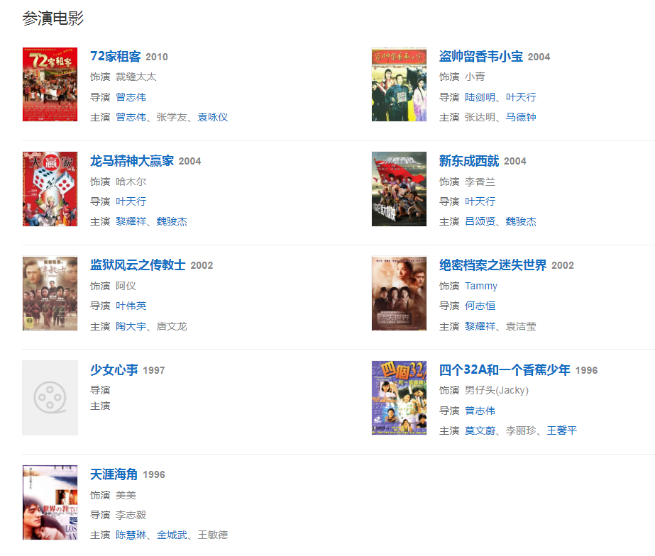 代表作品:《陀槍師姐》《倚天屠龍記》《美味情緣》《尋秦記》《雪山飛狐》