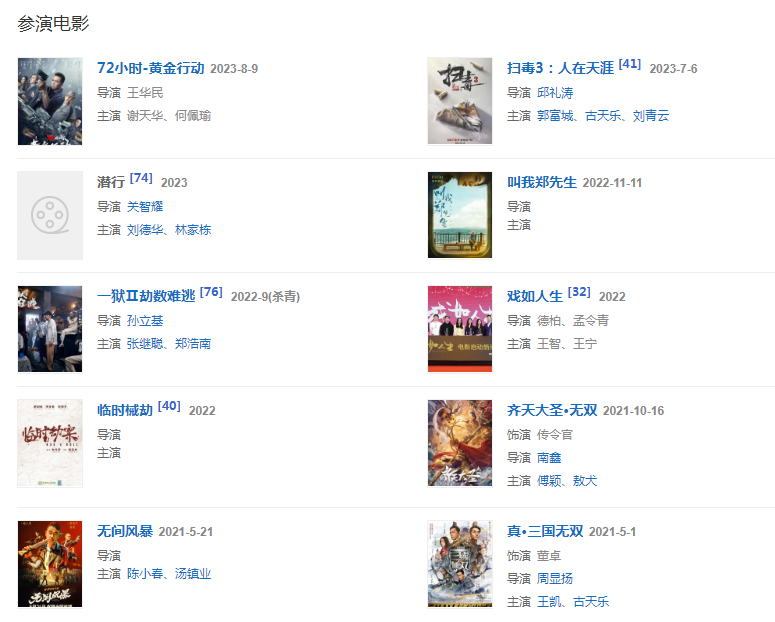 2021年3月18日,主演的奇幻親情喜劇電影《窈窕老爹》在愛奇藝獨家播出 。4月29日參與主演的電影《真·三國無雙》在中國香港上映、5月1日在中國大陸上映;5月,與陳小春、湯鎮(zhèn)業(yè)合力參演港式警匪片《無間風暴》。10月16日,參演的網(wǎng)絡(luò)電影《齊天大圣·無雙》正式在騰訊視頻全網(wǎng)獨播。