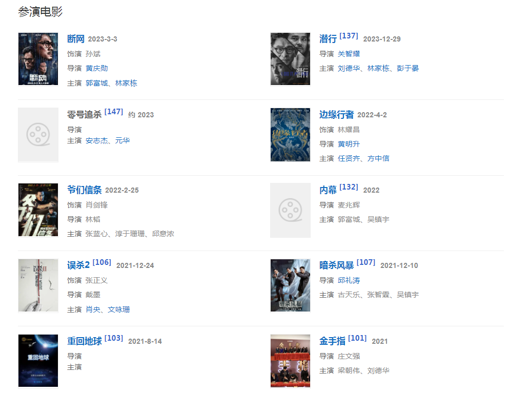 2023年3月29日,主演的電影《燈火闌珊》發(fā)布正式預(yù)告,4月13日在中國(guó)香港上映。4月2日,主演的電影《虎視眈眈》在長(zhǎng)白山舉行開機(jī)儀式。5月15日,參演的電影《暗殺風(fēng)暴》官宣定檔8月18日上映,并發(fā)布預(yù)告。6月19日,參演的電影《潛行》正式定檔12月29日上映。6月29日,參加《2023灣區(qū)升明月大灣區(qū)電影音樂晚會(huì)》 在中國(guó)香港,為大灣區(qū)而歌。20:00將在全網(wǎng)主要媒體平臺(tái)同步播出。