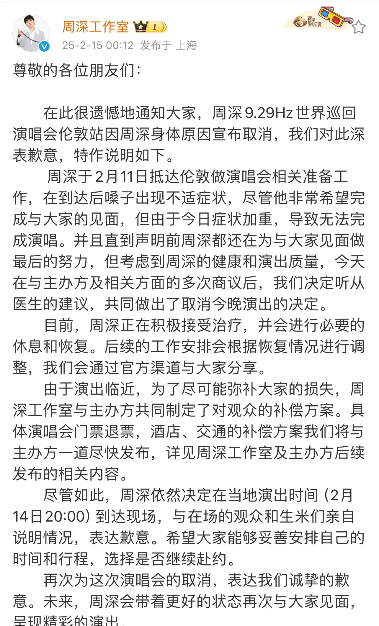 15日,周深工作室(明星經(jīng)紀(jì)公司)發(fā)布聲明,稱(chēng)原定于當(dāng)?shù)貢r(shí)間2月14日20點(diǎn)(北京時(shí)間2月15日4點(diǎn))的倫敦演唱會(huì)因周深身體原因宣布取消。