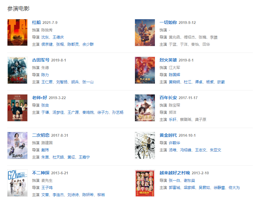 2009年主演新中國成立六十周年獻(xiàn)禮片《咱爸咱媽六十年》。