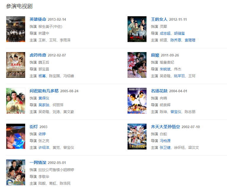 2005年,在古裝題材愛(ài)情劇《問(wèn)君能有幾多愁》中飾演黃保儀。